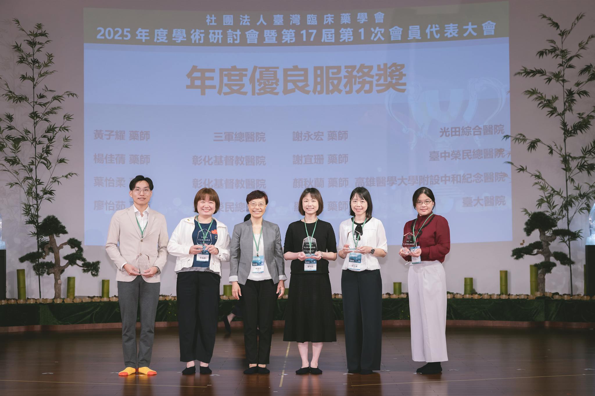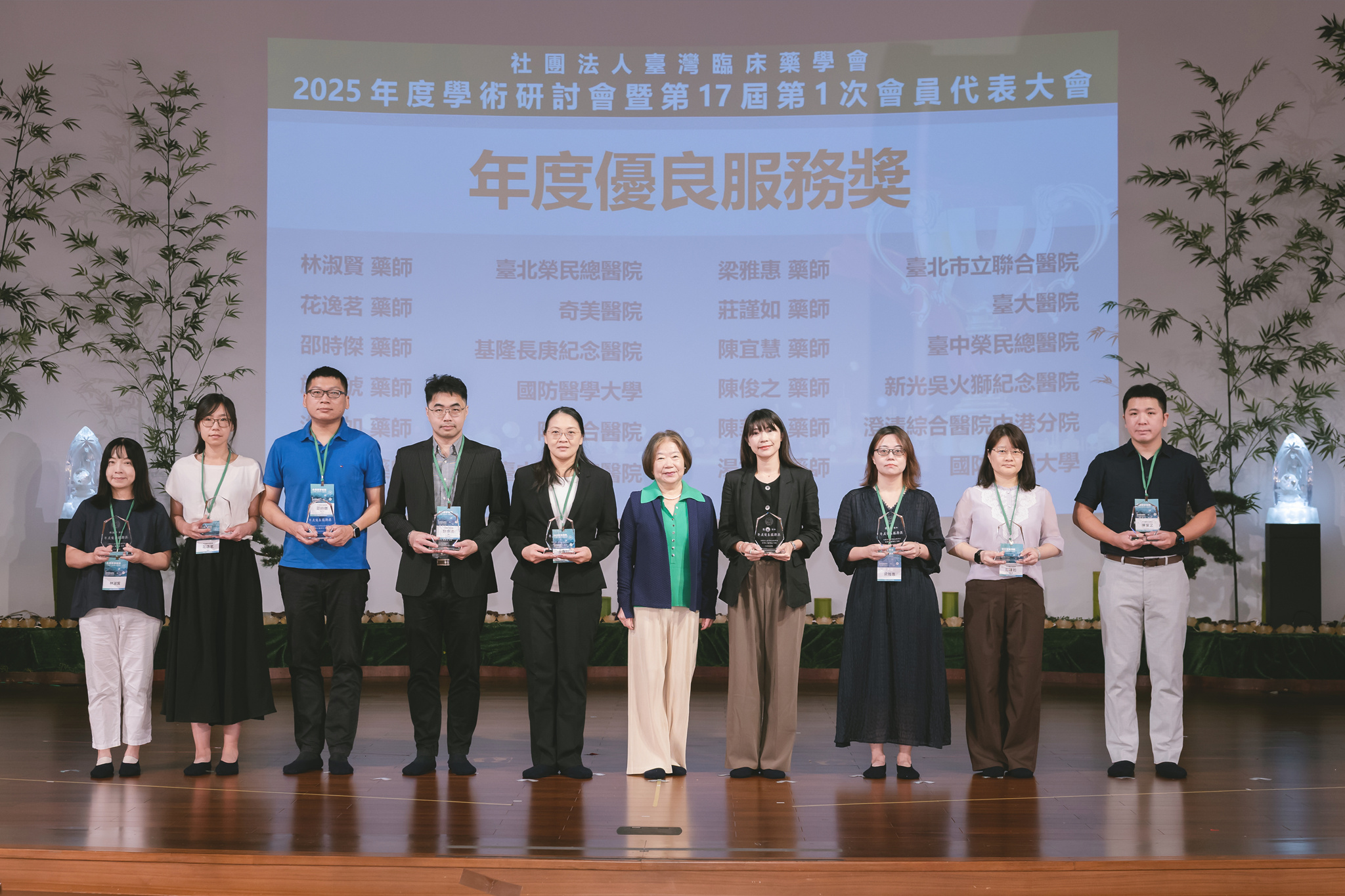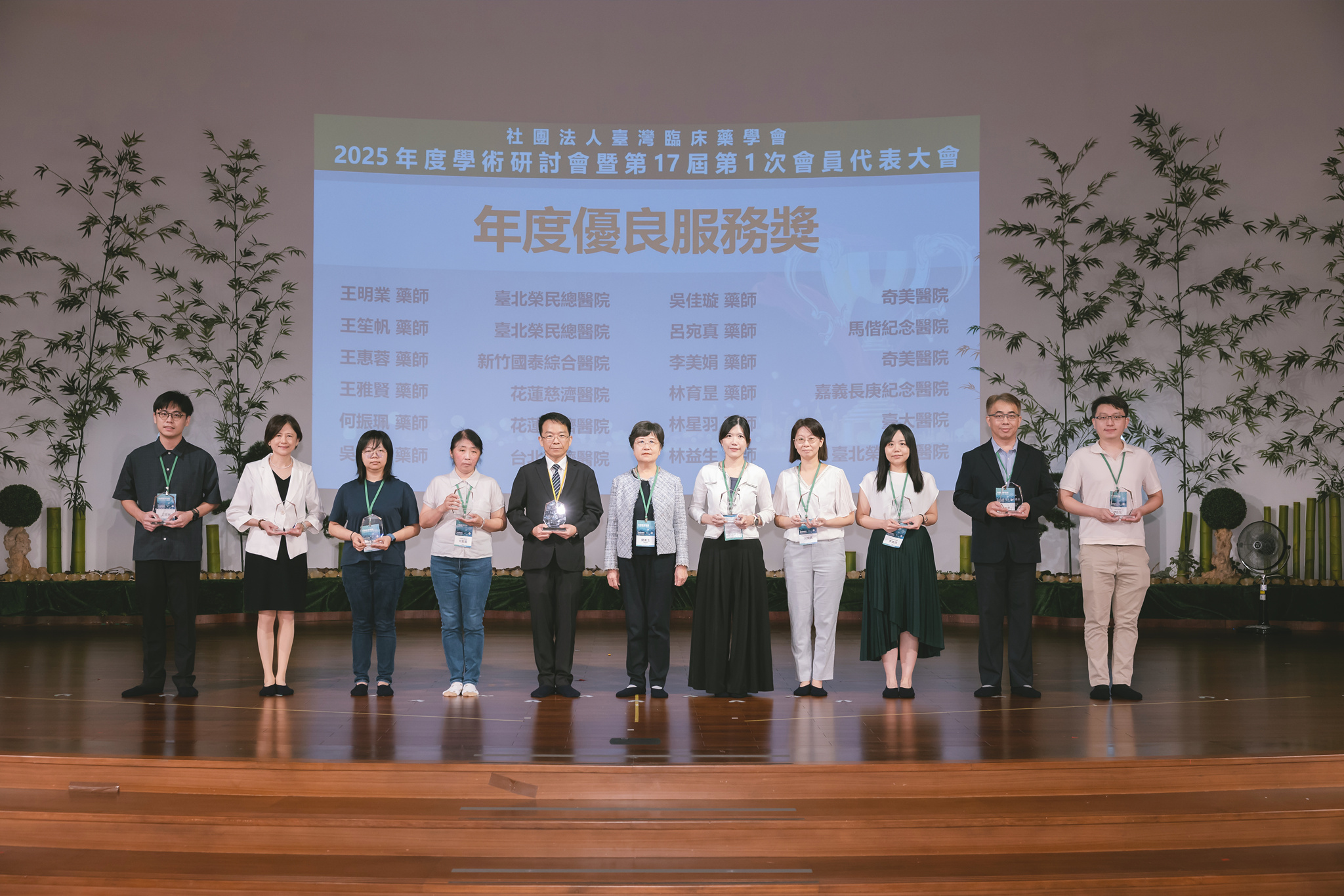 最後,頒發本年度優良服務獎、奉獻獎及傑出貢獻獎,感謝各界藥師們的付出,協助本會業務持續順利發展。此次以「永續藥學實踐:人工智慧、創新與全人健康照護」主題,期許藥師們持續攜手前進為全民健康努力,朝向永續經營發展。