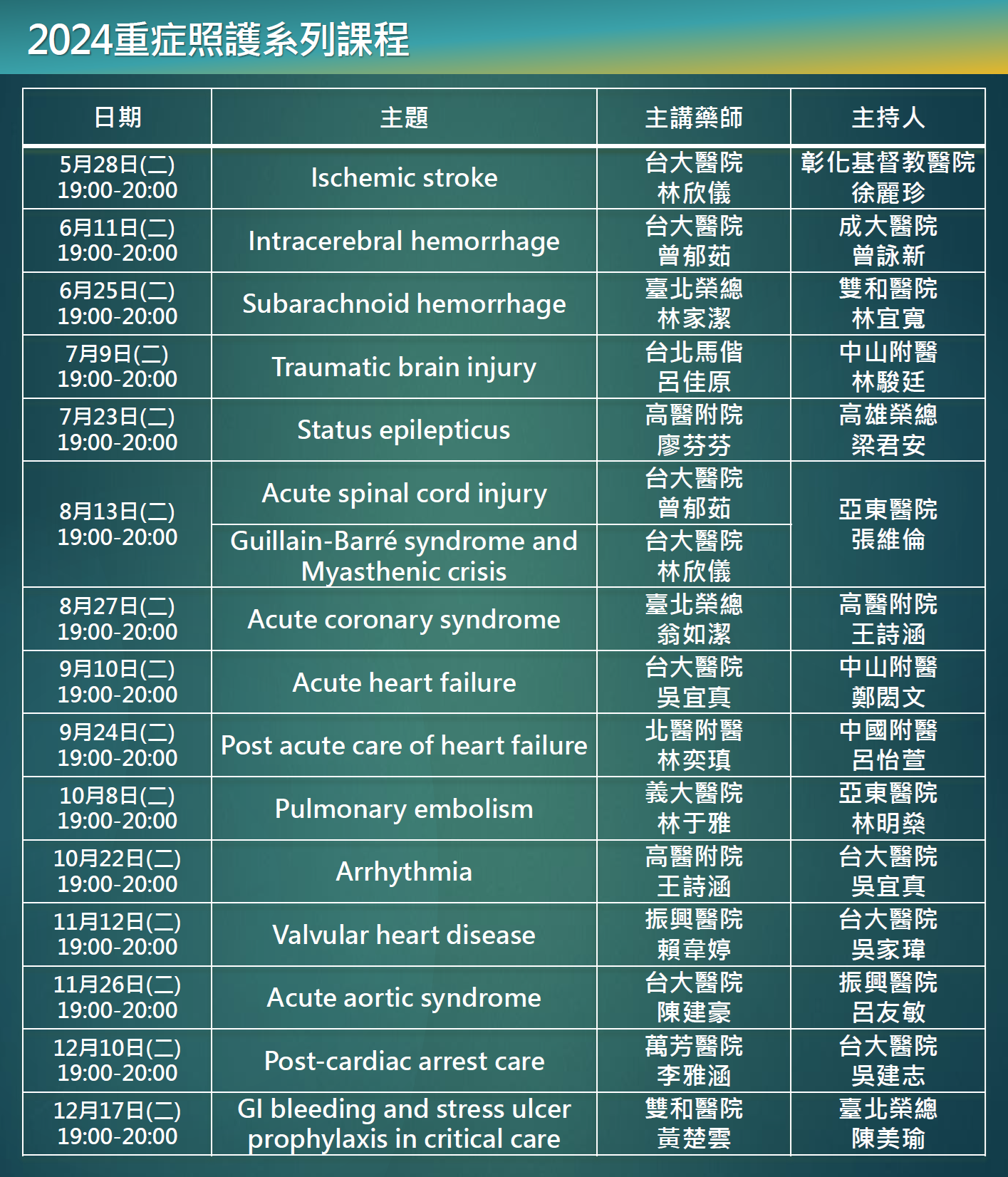 自108年起,健保署通過提升用藥安全與品質方案,明定藥師於加護病房提供藥事服務可獲得判斷性給付。自此,投入重症照護的藥師迅速增加。然而重症病人複雜性高,需具備特定知識方能提供適切的藥事服務。年輕藥師委員會延續2023年重症照護系列課程,籌畫於2024年線上舉辦15場神經、心臟重症相關課程,邀請各醫院熟悉相關主題的藥師講授課程,並輔以實際案例,讓與會者能快速習得相關技能以提供適切的藥事服務。