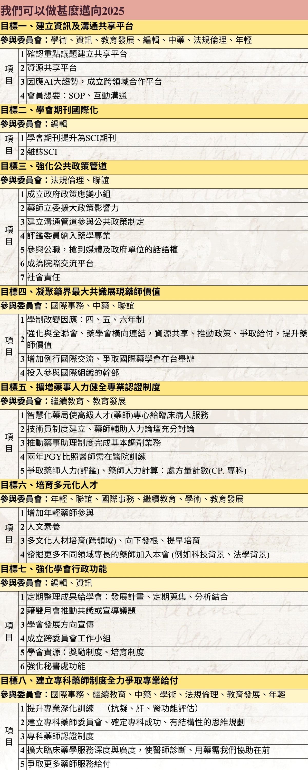 本會於112年3月5日舉辦十六屆共識營,在本屆理監事及主委們的踴躍參與與智慧貢獻,此次活動非常圓滿成功;大家的努力不僅產出了重要的共識,更進一步制定了具體的執行策略。秘書處於會後也將相關資料,彙整完成提供給各主委參考,以利各委員會據以擬定未來三年的工作計畫。 圖一、跨委員會共同規劃目標 圖二、臺灣臨床藥學會理事長於開場發表演講 圖三、監事會召集人胡幼圃教授 圖四、與會者專注聆聽演講 圖五、與會者積極參與共識營活動 圖六、理監事與主委們規劃邁進2025年 圖七、十六屆臨床藥學會共識營大合照